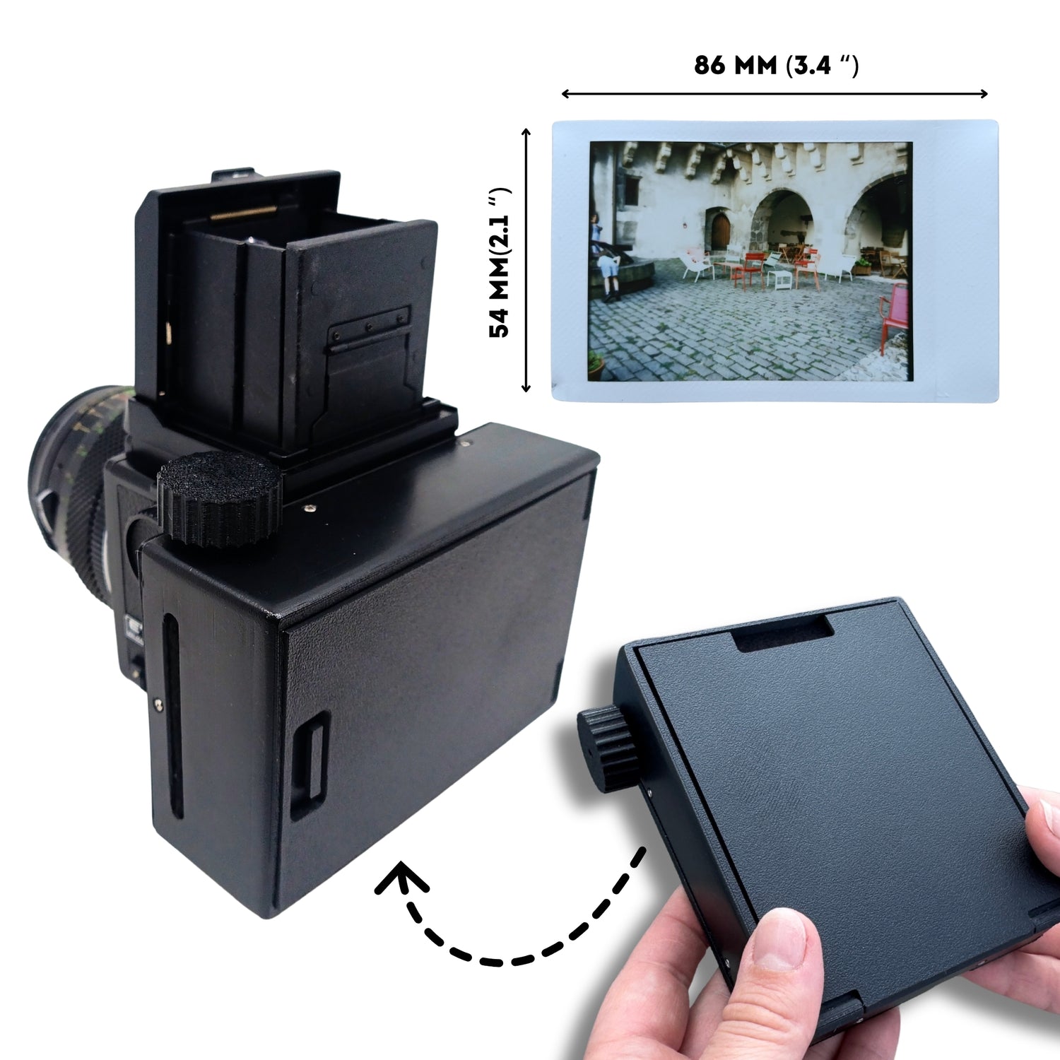 Currently, we are developing several instant backs, including the Instant Film Back for Mamiya RB67 (compatible with Instax SQUARE film) and the Instant Film Back for Bronica ETR/ETRS/ETRSi (compatible with Instax Mini film).
